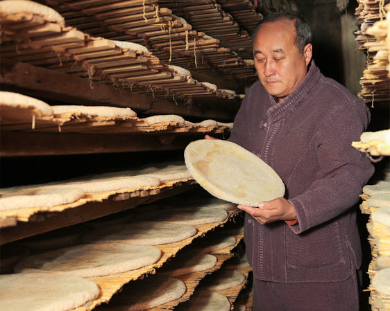 금정산성 유가네누룩은 보통 누룩처럼 도톰하게 딛지 않습니다. 베보자기에 싸서 발로 둥그렇고 납작하게 딛습니다. 이렇게 딛어진 누룩은 누룩방의 선반위에다 짚을 깔고 1주 정도를 열이 나게 띄웁니다. 잘 띄운 유가네누룩은 예부터 품질이 좋기로 입소문이 자자합니다.